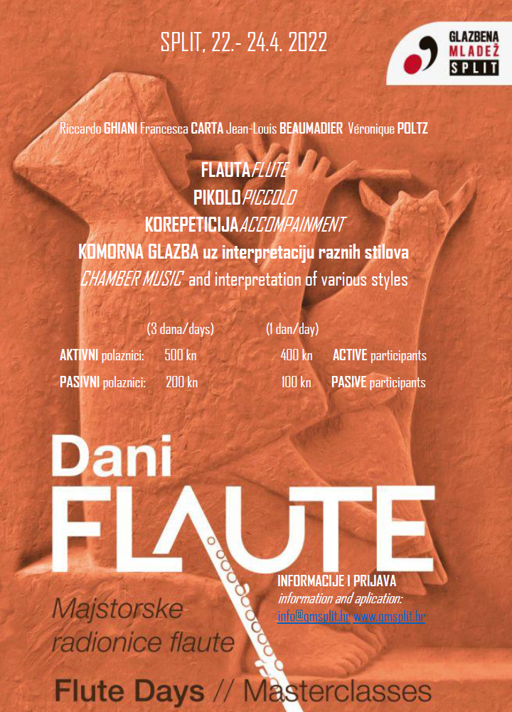 U sklopu dosadašnjih Dana flaute održani su brojni koncerti voditelja majstorskih radionica i studenata tj. učenika. Tako su Dani Flaute osim u Splitu (Foyer splitskog HNK, Muzej Grada Splita, Umjetnička Akademija) održani u Kaštelima, Solinu, Omišu, Makarskoj,Braču i Imotskom. Na ovom prekrasnom i edukativnom glazbenom putovanju pridružili su nam se Raphael Leone (Švicarska – Austria), Sophie Duffeutrele (Francuska), Alenka Zupan (Slovenija), Matej Grahek (Slovenija), Hansgeorg Schmeiser (Austria), Karl-Heinz Schütz (Austria), Marianne Stucki (Švicarska), Roz Trübcher, (Velika Britanija), Jean-Louis Beaumadier (Francuska), Gülsen Tatu (Turska) i mnogi drugi.
